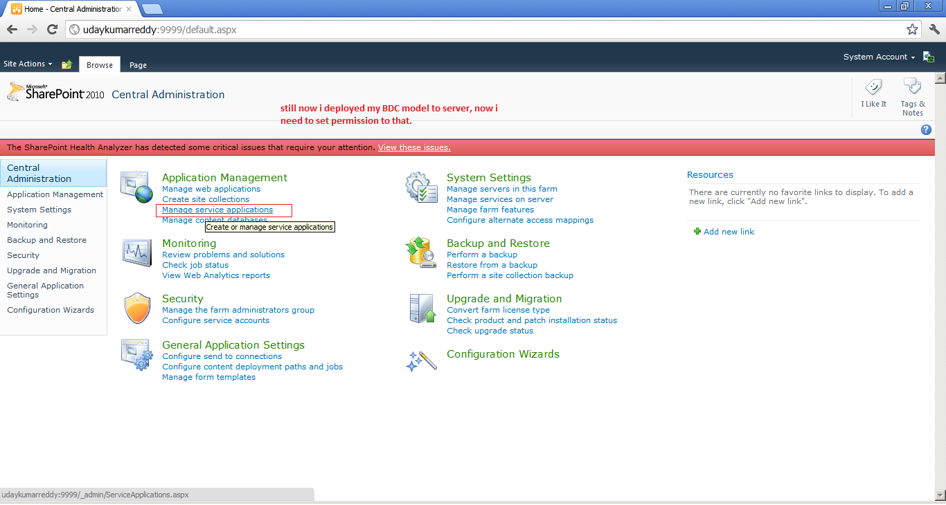 22. After successfully deployment. Go to Central Administration and click on "Manage Service applications".