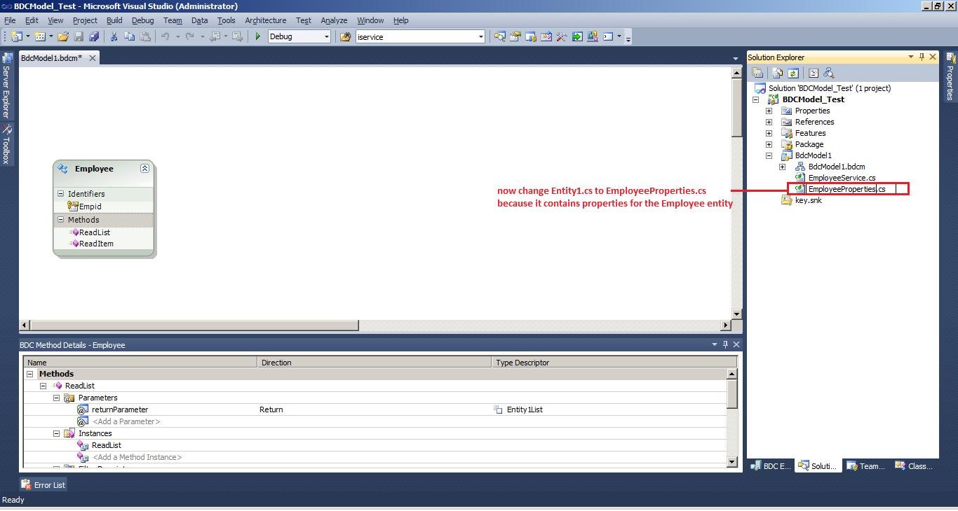 5. It will show BDC Model with default entity, now rename that entity name to 'Employee' from entity properties.