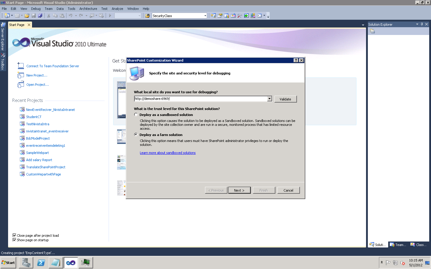 3. Now it will open SharePoint Customization Wizard, in this specify 'What local site do you want to user for debugging' here it is "http://demoshare:6969" and 'what is the trust level for this SharePoint Solution' here am choosing Farmlevel so it is Deploy as a farm solution.