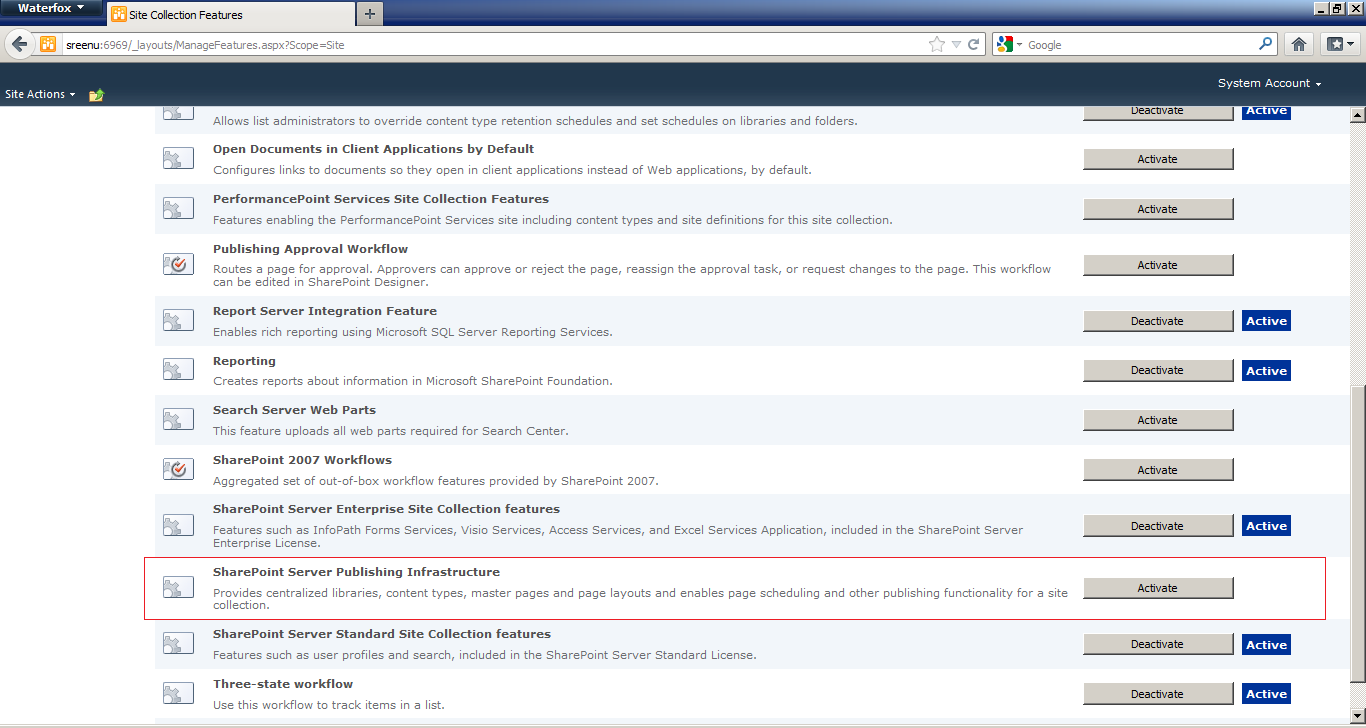 2. SharePoint Server Publishing (Manage site features under "Site Actions").