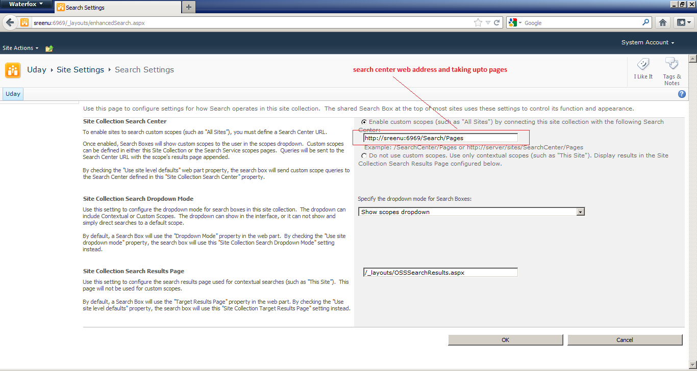 4. Select 'Enable custom scopes by connecting this site collection with the following search center' and