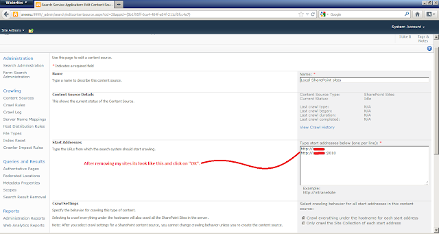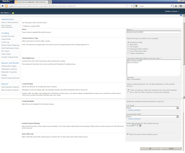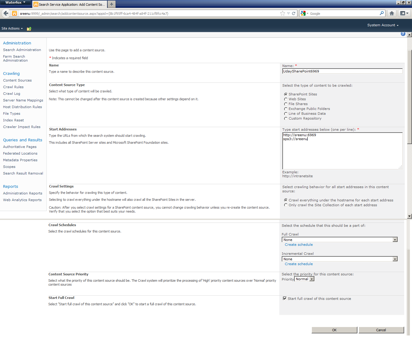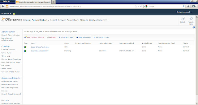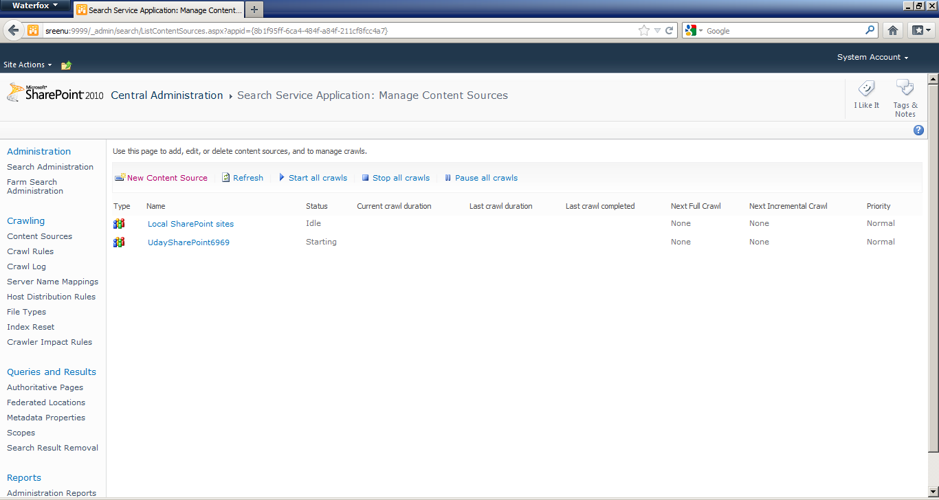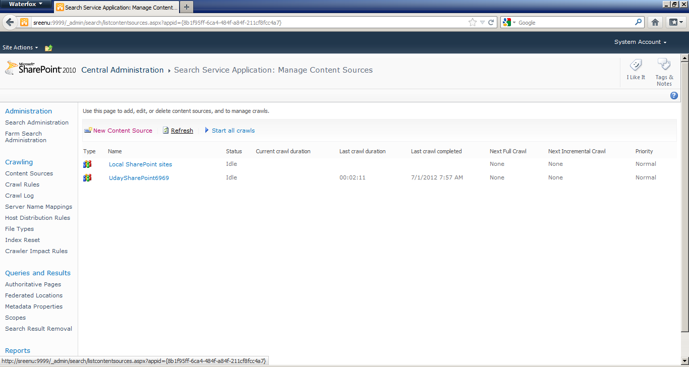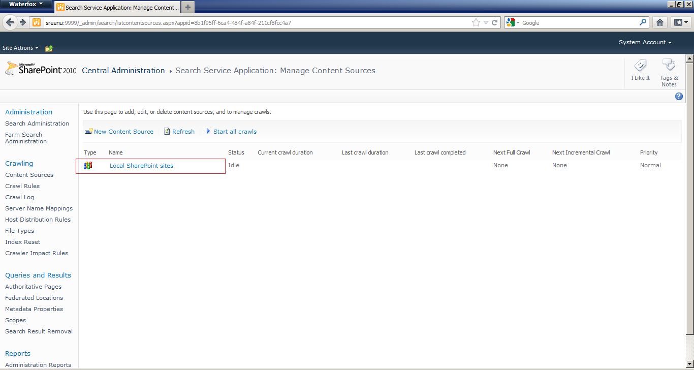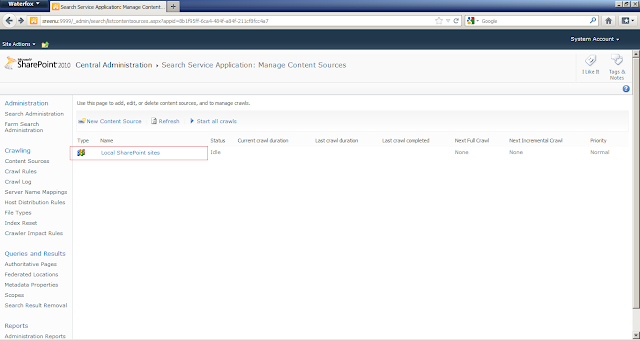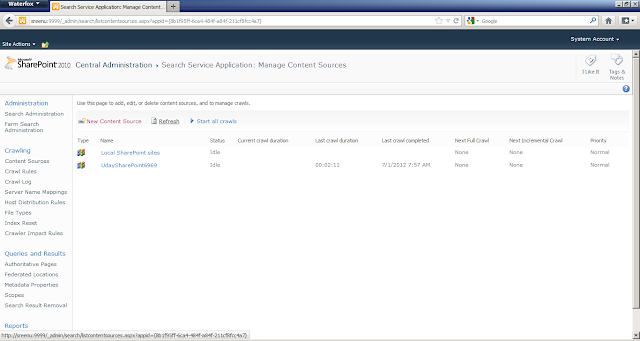 7. Now click on Content sources under Crawling, click on 'New Content Source'.