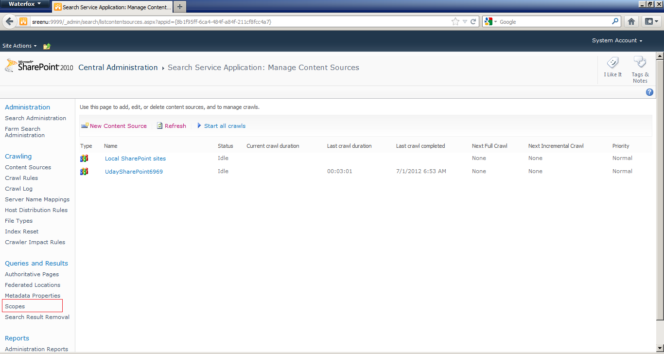 8. After Completion of crawl, click on Scopes under 'Queries and Results'.