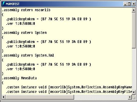 If you run IDASM.EXE from the path you will be popped with the IDASM exe program as shown in figure. Click on file and browse to the respective directory for the DLL whose assembly you want to view. After you select the DLL you will be popped with a tree view details of the DLL as shown in figure ILDASM. On double clicking on manifest, you will be able to view details of assembly, internal IL code etc as shown in the figure.