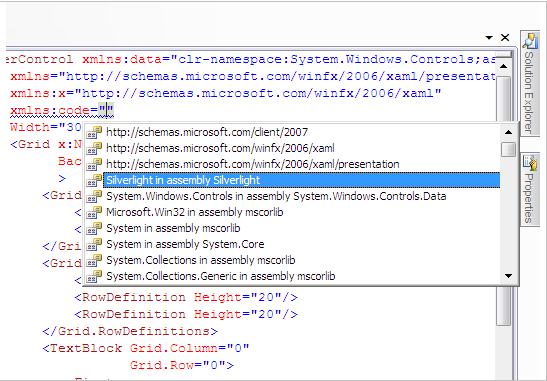 <UserControl xmlns:data="clr-namespace:System.Windows.Controls;assembly=System.Windows.Controls.Data" x:Class="Silverlight.Page" xmlns="http://schemas.microsoft.com/winfx/2006/xaml/presentation" xmlns:x="http://schemas.microsoft.com/winfx/2006/xaml" xmlns:code="clr-namespace:Silverlight" Width="300" Height="300">