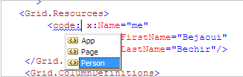 <code:Person x:Name="me" FirstName="Bejaoui" LastName="Bechir" PseudoName="Yougethen"/>